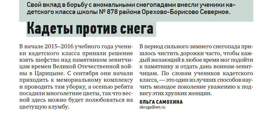 В газете Южного административного округа "Южные Горизонты" от 12-18 февраля 2016 г. №5, размещена статья "Кадеты против снега". Ребята внесли свой вклад с аномальными снегопадами.