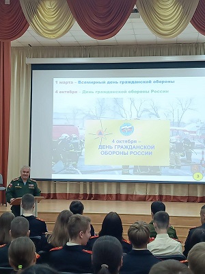 7 октября 2024 года во всех кадетских классах прошёл Открытый урок, посвящённый Дню Гражданской обороны России. До учащихся были доведены история создания и формирования подразделений Гражданской обороны в нашей стране, показаны архивные видеоматериалы и проведено практическое занятие по действиям в чрезвычайных ситуациях.