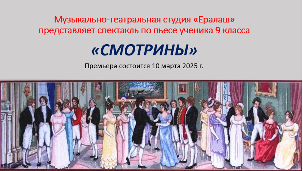 В предверии весеннего праздника школьный театр "Ералаш" готовит премьеру спектакля "Смотрины" с участием 8 класса, которая состоится 10 марта.