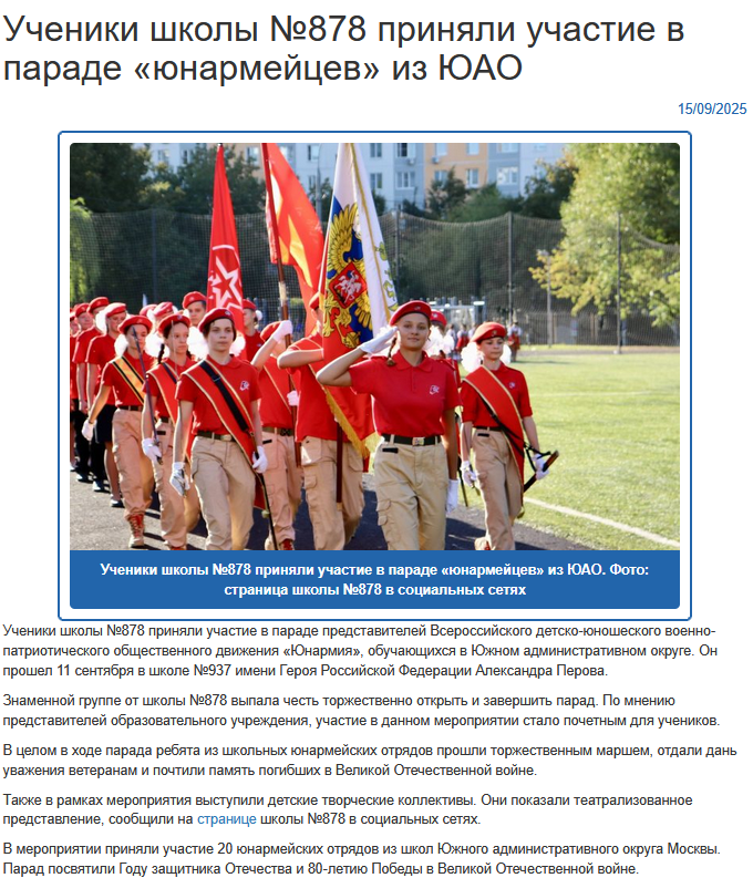 Ученики школы №878 приняли участие в параде «юнармейцев» из ЮАО.