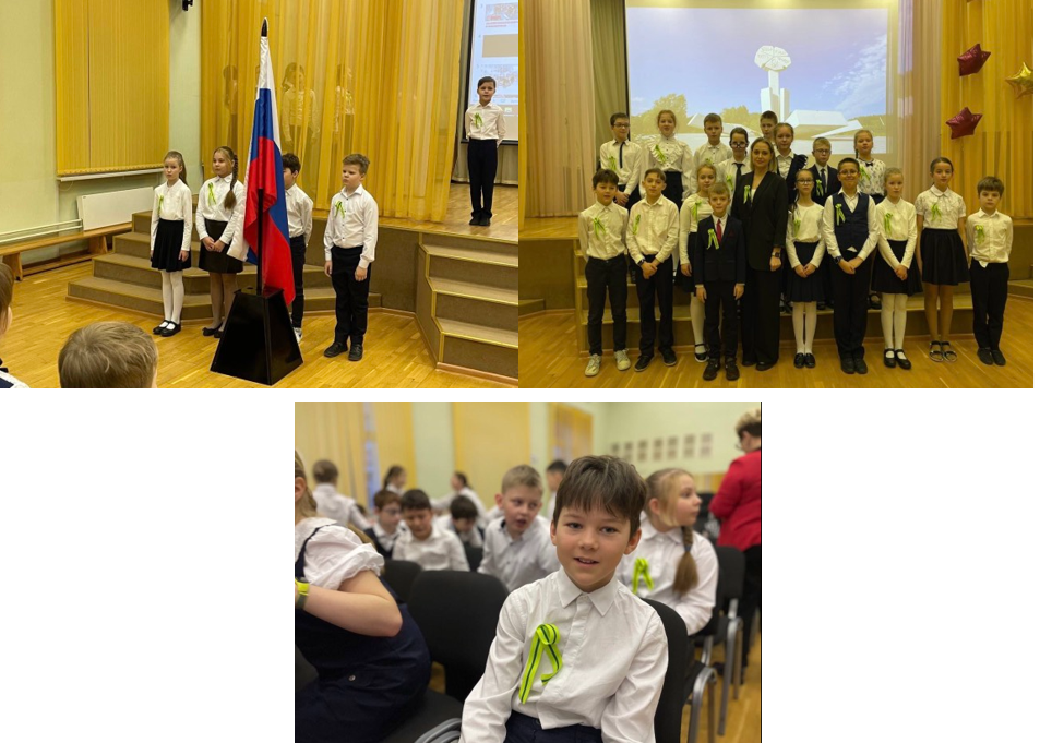 Ученики начальной школы присоединились к замечательной акции "Ленточка Ленинградской Победы", расположив этот особый символ на груди. Оливковый цвет символизирует Победу, зеленый — цвет жизни.
